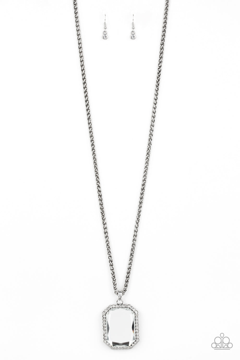 Bordered in dainty white rhinestones, an oversized faceted white emerald style gem swings from the bottom of an antiqued silver wheat chain for a blinding look. Features an adjustable clasp closure.